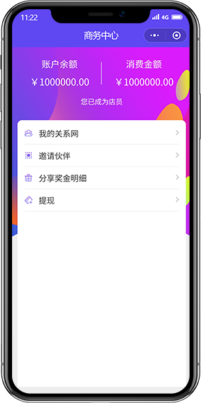 用戶消費(fèi)到一定額度后,可以申請成為分銷商,把本平臺(tái)分享給微信好友,當(dāng)好友登陸后就會(huì)成為你的下級(jí)